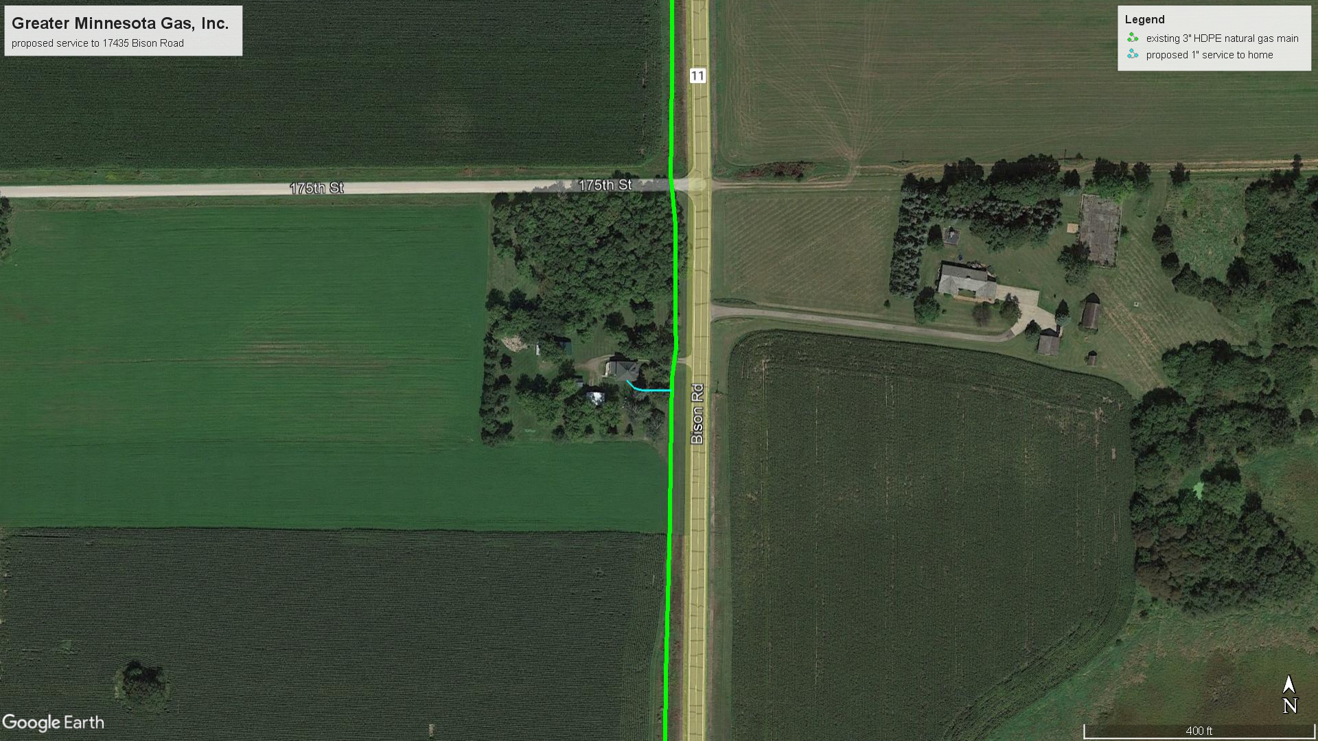 | Construction Description: | install 1" HDPE natural gas service line from existing 3" HDPE natural gas main installed in west Bison Road right of way to home at 17435 Bison Road |