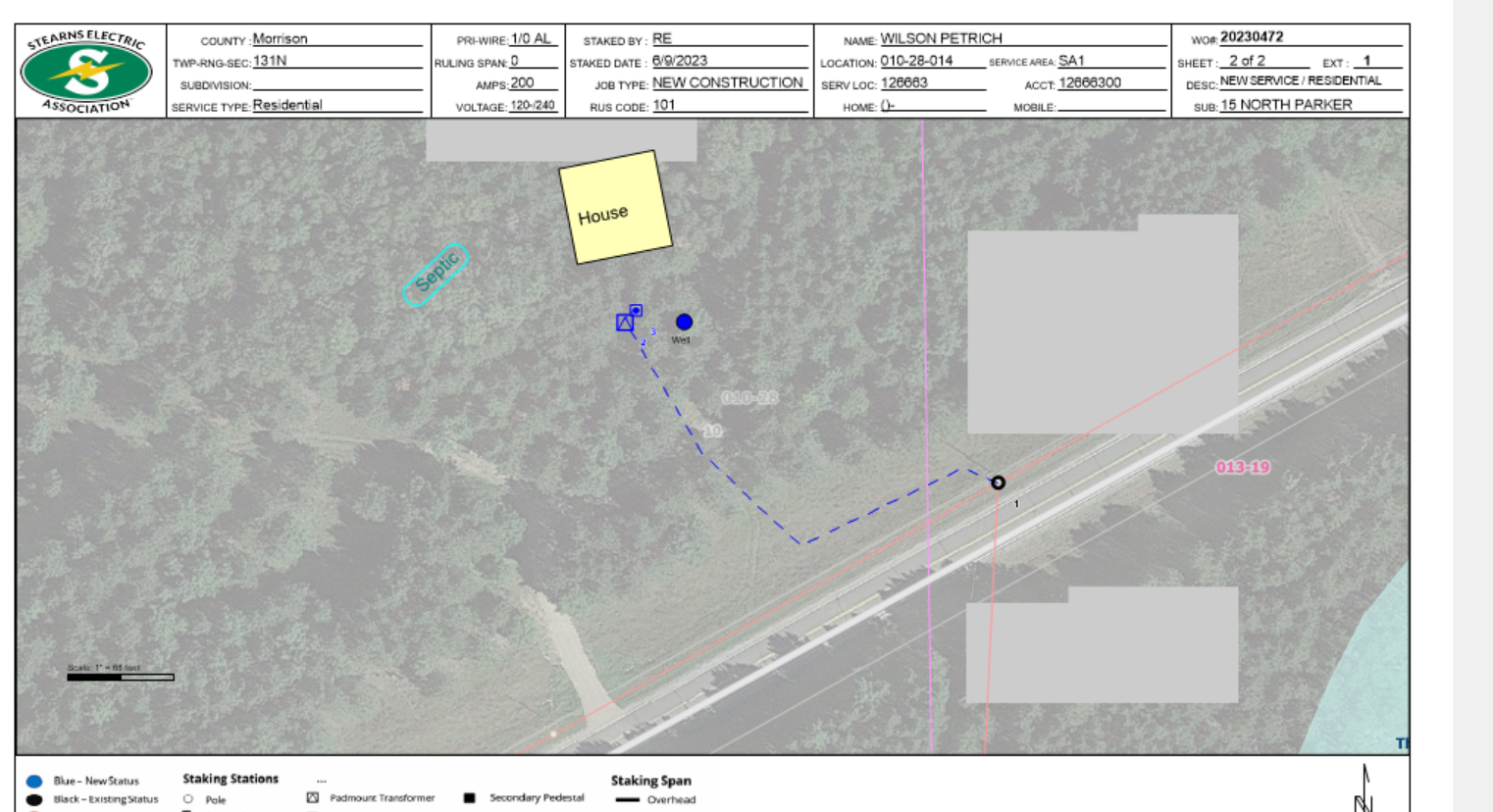 | Construction Description: | Starting at existing Pole 32' from center line, 340 feet East of Address 9437 Co Rd 206/ Emerald Road. Install underground single phase parallel to the Co Rd in the north right of way at 44' East to private property for a new Home. |