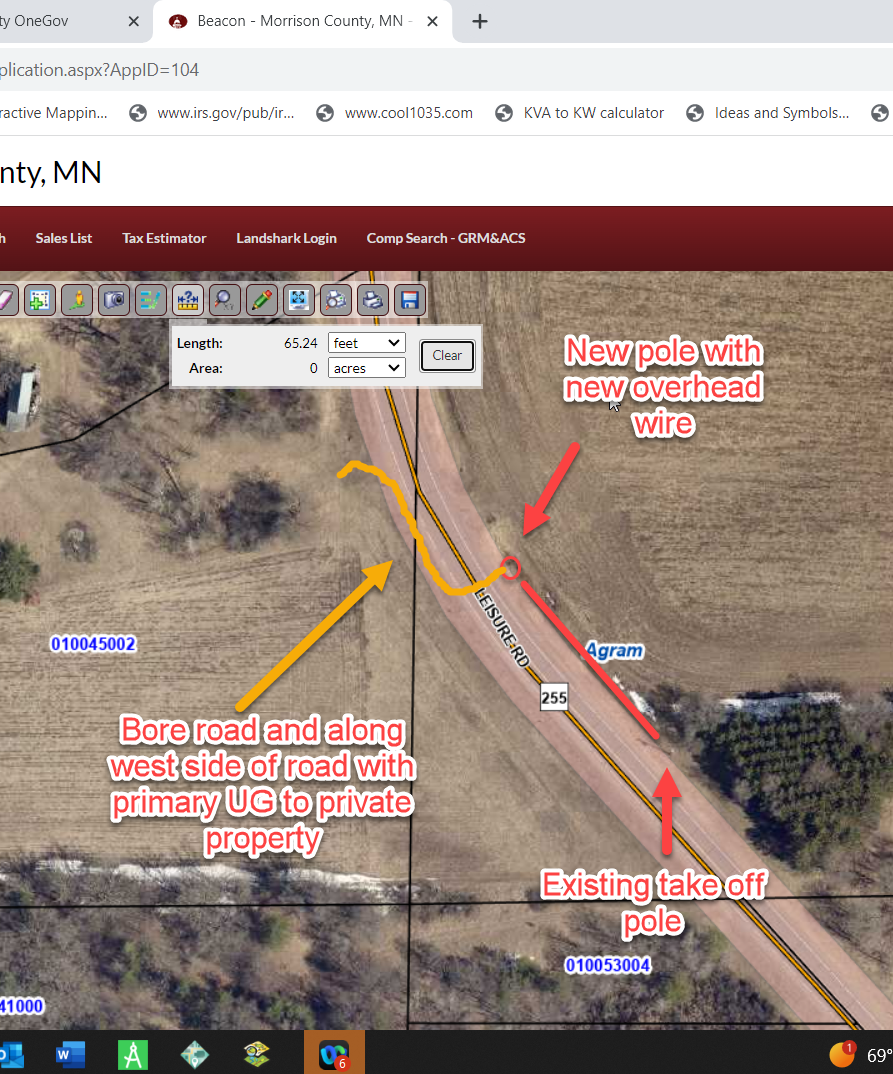 | Construction Description: | Install 1 new pole with primary overhead. Bore county road 255 (Leisure Road) from east to west and install primary wire under and along road |
