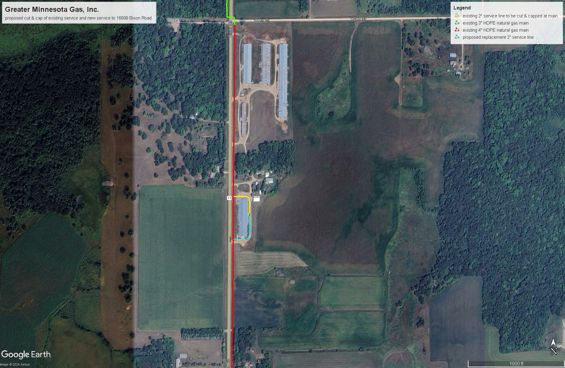 | Construction Description: | cut & cap existing 2" service line to turkey barn at 16698 Bison Road and reinstall new line to south of barn to accommodate new construction on site |