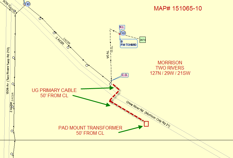 | Construction Description: | INSTALLING UG PRIMARY ELECTRICAL CABLE FROM TAKE OFF POLE EAST OF DRIVEWAY, GOING 40' EAST -THEN GOING SOUTH 100' UNDER CNTY RD 21 -THEN GOING EAST ANOTHER 340' THEN INSTALLING A PAD MOUNT TRANSFORMER |