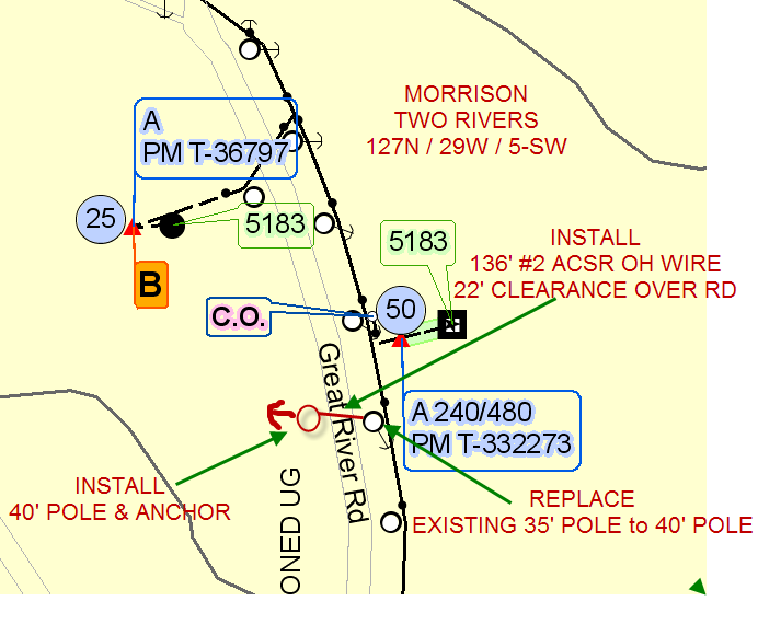 | Construction Description: | Replace existing 35' pole to 40' pole on east side of RD, Install 40' pole on West side of RD & #2 acsr electric wire crossing overhead with a minimum of 22' height clearance |