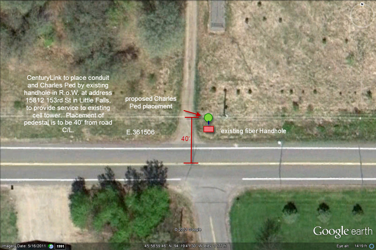 | Construction Description: | Place new Charles pedestal and 24" of 2" PVC conduit from existing handhole to new Charles pedestal...may hand dig. |