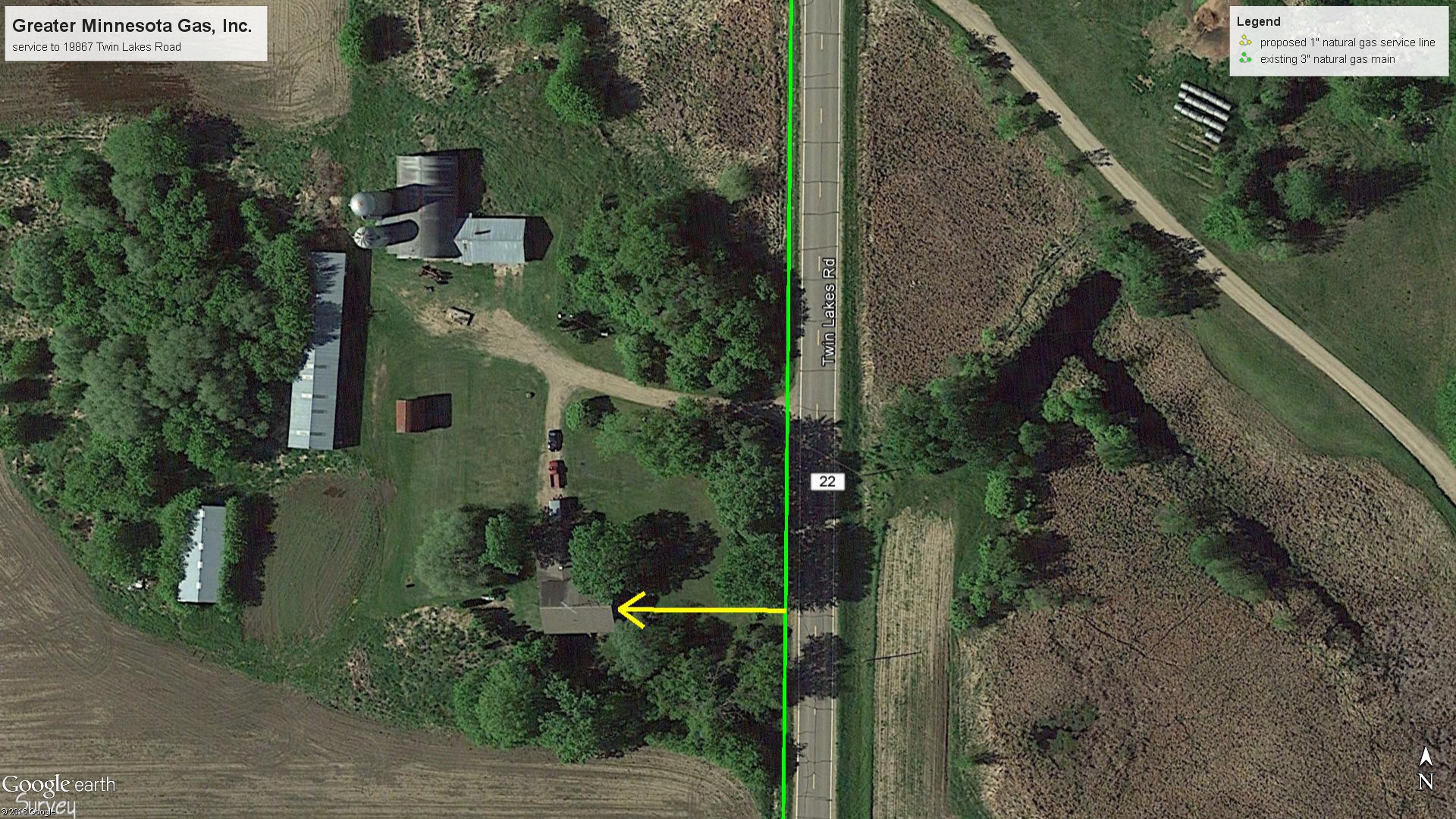 | Construction Description: | install natural gas line to 19867 Twin Lakes Road from existing 3" natural gas main in west right of way of CSAH 22 |