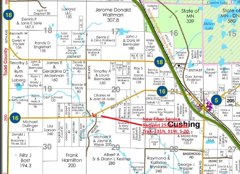 | Construction Description: | Place New Fiber Cable for New Service Request. From 80' west of Agate Trail on N. side CR # 16 going south to south side 112 Ft then east 50ft and north on west side of Agate Trail. Directional Bore for 100' at 60" depth under road and 36" depth in R/W |