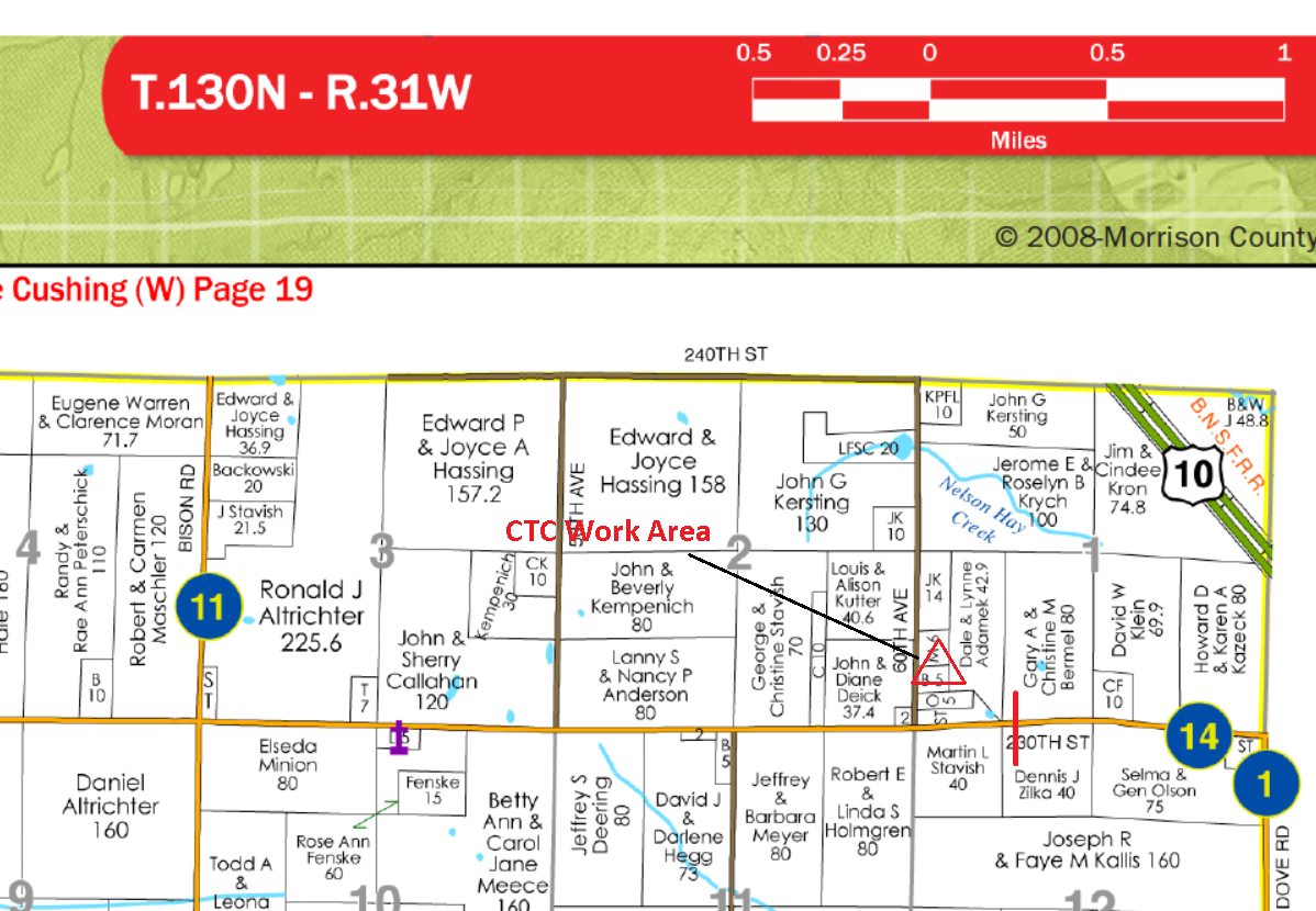 | Construction Description: | Place 1.25" Conduit for new fiber serv request @ 6298 230th St / CR 14 at 34' west of the driveway CL going from 56' south of CR 14 CL to 76' north of CR 14 CL |